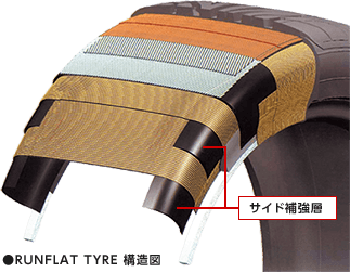 走行中、完全なパンク状態(空気圧ゼロ)になっても、所定の速度で一定の距離の走行が可能です。